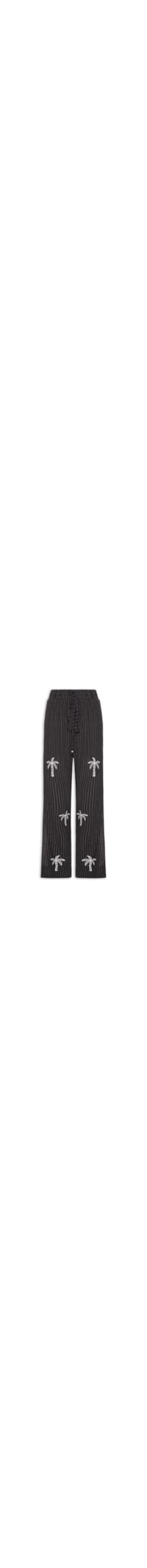 A calça preta é confeccionada em tecido leve com toque de linho sem elasticidade. A peça solta ao corpo possui cintura alta com cordão embutido para ajustes, bolsos frontais de modelo faca, fendas laterais, padronagem listrada, comprimento longo e superfície em bordados de cor contrastante.