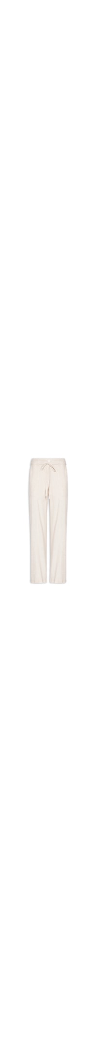 A calça bege é confeccionada em tecido leve com toque de linho e sem elasticidade. A peça solta ao corpo possui cós com passantes e elástico embutido na parte posterior, bolsos frontais modelo faca, cintura alta, passantes com tira alongada para amarração aplicados na parte frontal, forro, comprimento longo e fechamento frontal por botão e zíper.