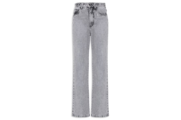 A calça cinza é confeccionada em tactel sem elasticidade. A peça solta ao corpo possui cintura alta, cós com elástico embutido, bolsos frontais modelo faca, recortes posteriores e frontais, superfície plissada e comprimento longo.