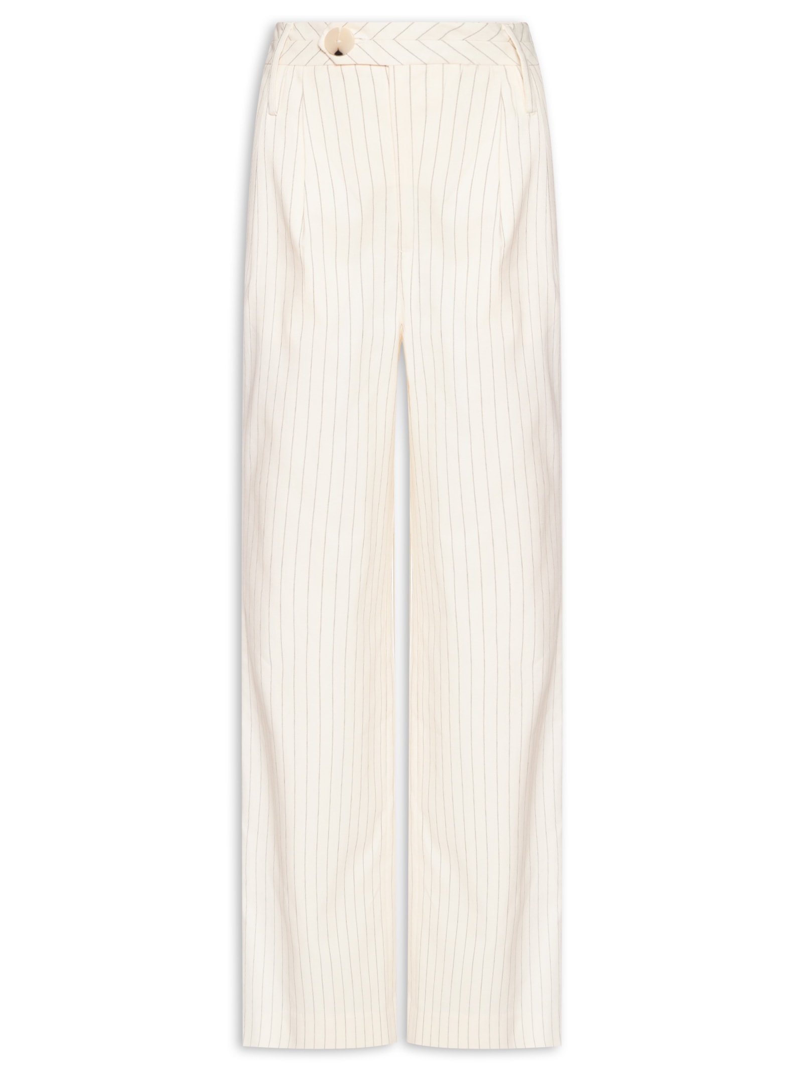 A calça branca é confeccionada em tecido leve com toque de linho sem elasticidade. A peça solta ao corpo possui cintura alta, cós com passantes, pences posteriores, bolsos posteriores decorativos com botão aplicado, bolsos frontais modelo faca, padronagem listrada na cor preta, pregas frontais, comprimento longo e fechamento frontal por botões e zíper.