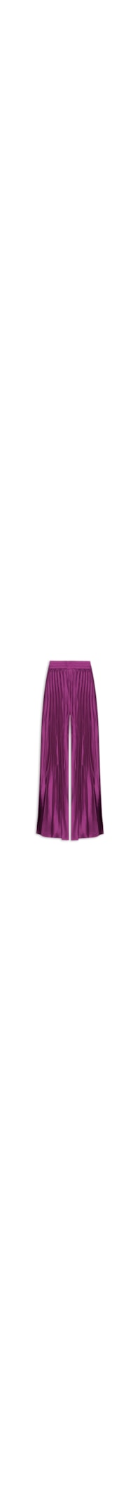 A calça roxa é confeccionada em tecido leve com superfície acetina e efeito plissado. A peça solta ao corpo de modelo pantalona possui cintura alta, cós com elástico embutido e comprimento longo.
