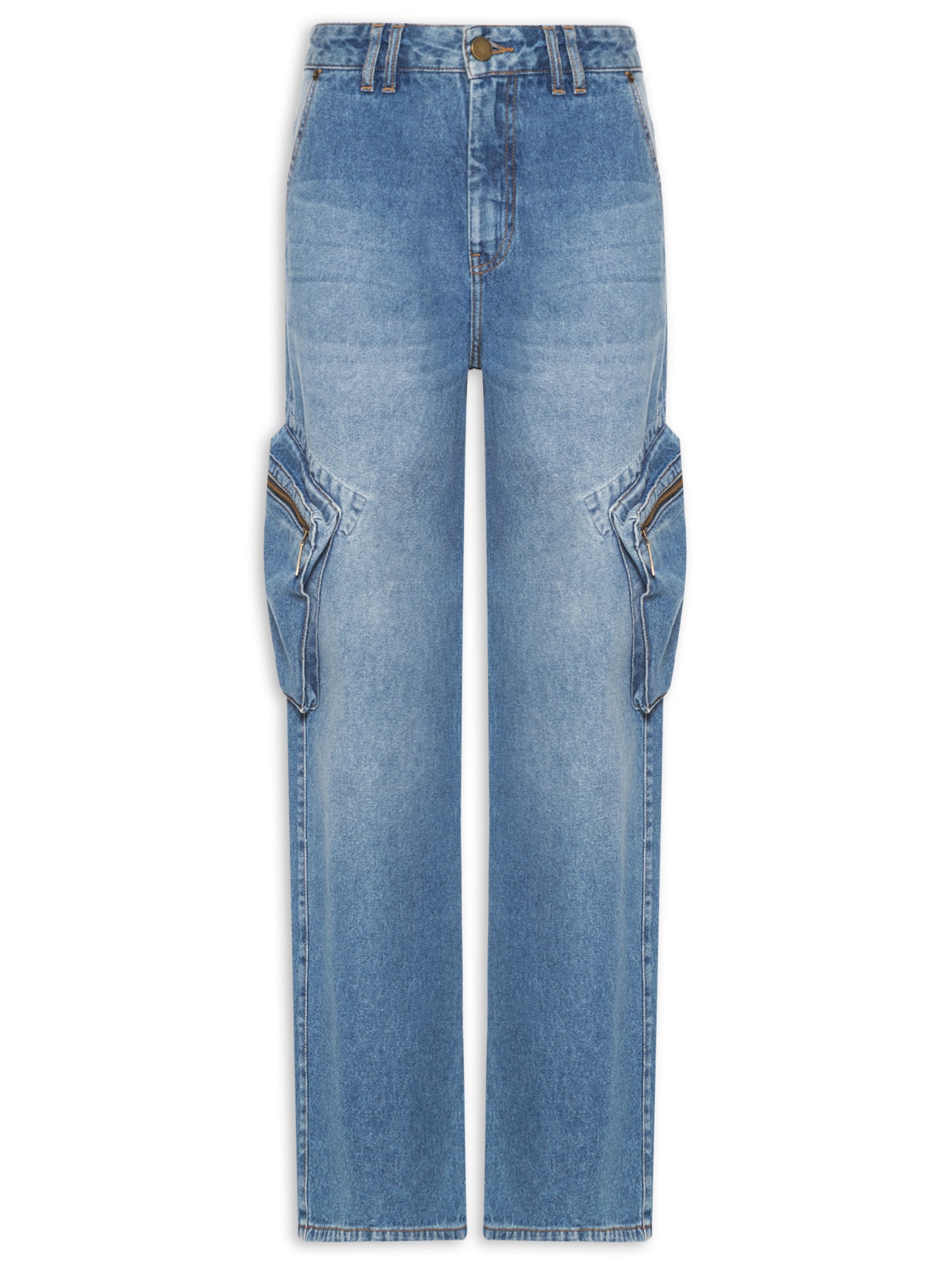 A calça azul é confeccionada em sarja com lavagem jeans e sem elasticidade. A peça solta ao corpo possui cintura alta, cós com passantes aplicados, bolsos frontais de modelo faca, bolsos posteriores, recorte posterior, bolsos laterais com fechamento em zíper, efeito estonado, comprimento longo e fechamento frontal em zíper e botão.