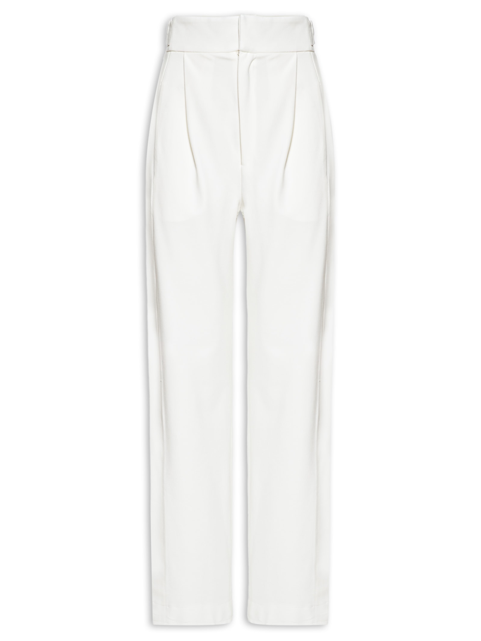 A calça branca é confeccionada em malha de média elasticidade. A peça solta ao corpo possui cintura alta, cós com tiras médias sobrepostas nas laterais com aviamento metálico e botão de pressão, bolsos laterais embutidos, prega lateral, pences posteriores, comprimento longo e fechamento frontal em zíper e colchetes.