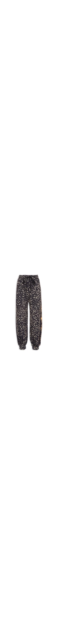 A calça preta é confeccionada em moletom de baixa elasticidade. A peça solta ao corpo de modelo jogger* possui cintura média, cós elástico com tira alongada embutida para ajuste e amarração frontal, estampa figurativa em tons contrastantes, elástico embutido na barra e comprimento longo.