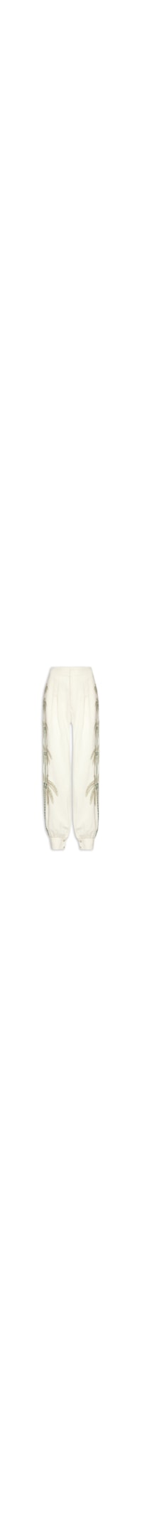 A calça bege é confeccionada em tecido leve sem elasticidade. A peça de modelo jogger* solta ao corpo possui cintura alta, pregas posteriores e frontais, bolsos frontais embutidos, mix de estampas na cor verde, ajuste nas barras com detalhe de franzido e abotoamento nas partes laterais, comprimento longo e fechamento frontal por botões, colchetes e zíper.