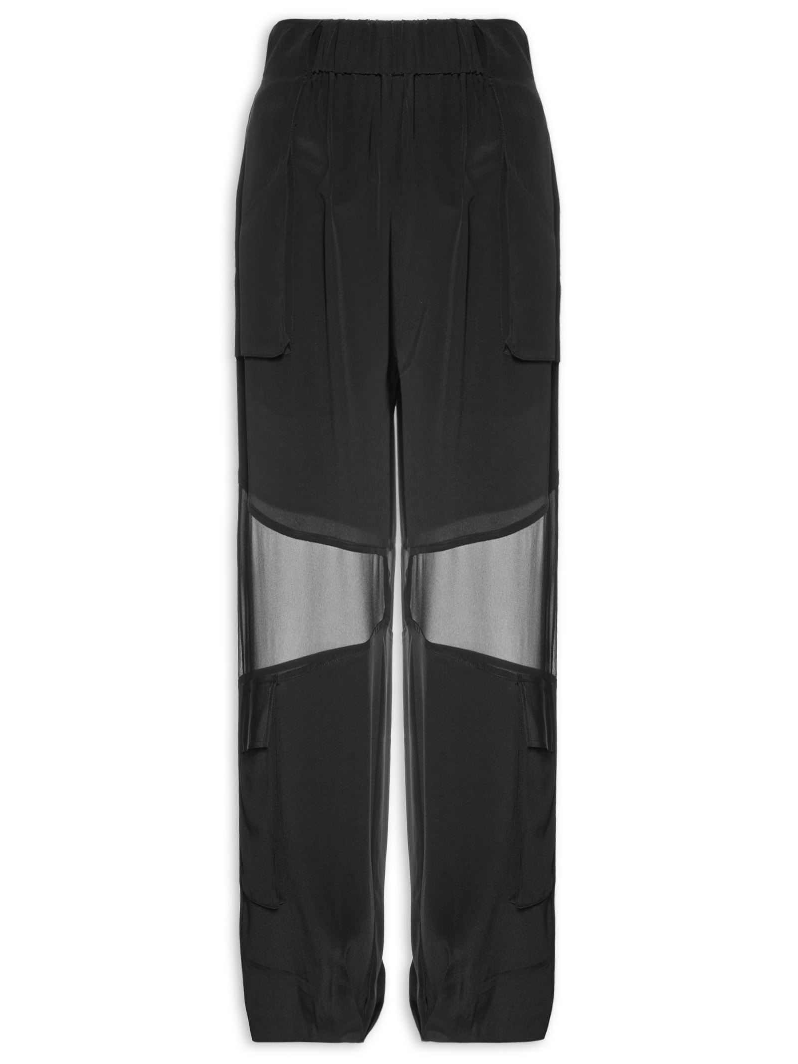 A calça preta é confeccionada em seda sem elasticidade. A peça solta ao corpo possui cintura alta, cós com passantes e elástico embutido na parte frontal, bolsos frontais de modelo faca, recorte posterior, bolsos posteriores, bolsos laterais de modelo cargo, recorte com transparência na altura dos joelhos e comprimento cropped*.