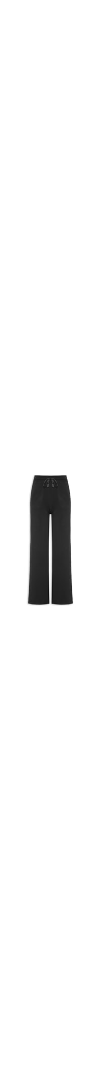 A calça preto é confeccionada em moletom com baixa elasticidade. A peça solta ao corpo possui cintura alta, cós com elástico e cordão embutido para amarração frontal, bolsos frontais modelo faca, recortes frontais e posteriores e comprimento longo.
