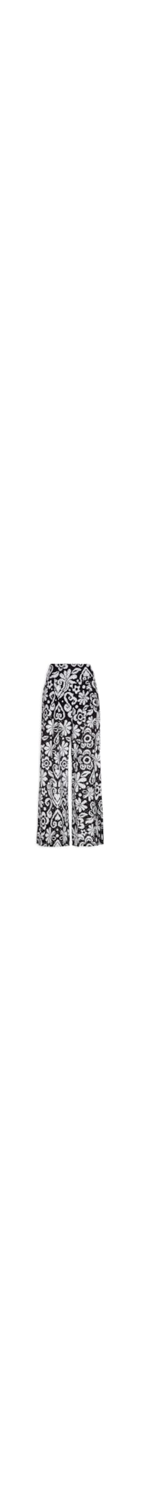 A calça preta é confeccionada em tecido de laise sem elasticidade. A peça solta ao corpo, possui cintura alta, cós largo, pregas frontais, fendas laterais, mix de estampas figurativas em cores contrastantes, comprimento longo, forro e fechamento posterior por zíper invisível.