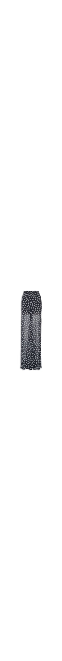 A calça preta é confeccionada em crepe sem elasticidade. A peça solta ao corpo possui cintura alta, cós amplo em lastex, meio forro, transparência, estampa de gravataria branca, fendas laterais e comprimento longo.