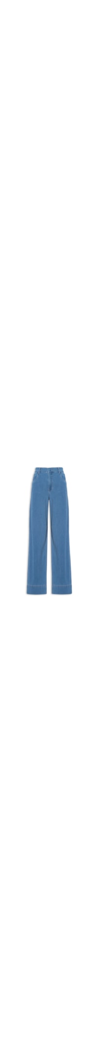 A calça azul é confeccionada em sarja com superficie canelada e com lavagem jeans. A peça de modelo pantalona possui cintura alta, cós regular com passantes aplicados, pences posteriores, 5pockets*, barra inferior estendida, fechamento frontal em zipér com botão aplicado no cós e shape solto