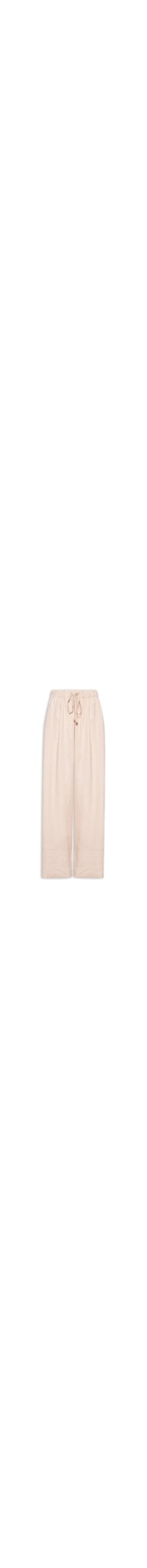 A calça bege é confeccionada em linho misto, sem elasticidade. A peça de modelo pantalona possui cós com elástico e cordão embutidos para ajuste, dois bolsos frontais, detalhes de metal aplicados no cordão, recorte nas barras, comprimento longo.