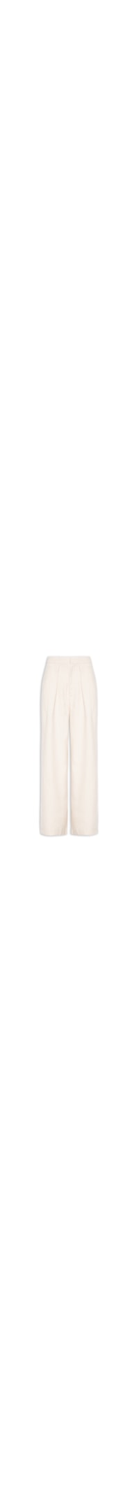 A calça bege é confeccionada em tecido leve com toque de linho sem elasticidade. A peça de modelo pantalona solta ao corpo possui cintura alta, pences posteriores, bolsos frontais embutidos, pregas frontais, comprimento longo e fechamento frontal por botão, colchete e zíper.