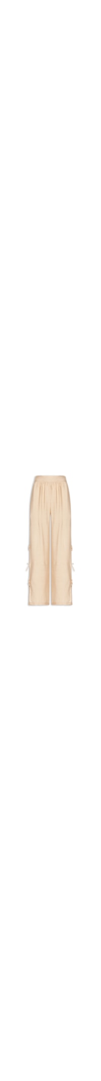 A calça bege é confeccionado em tecido leve sem elasticidade. A peça solta ao corpo possui cintura alta, cós posterior elástico, fendas laterais com detalhes em amarrações e comprimento longo.