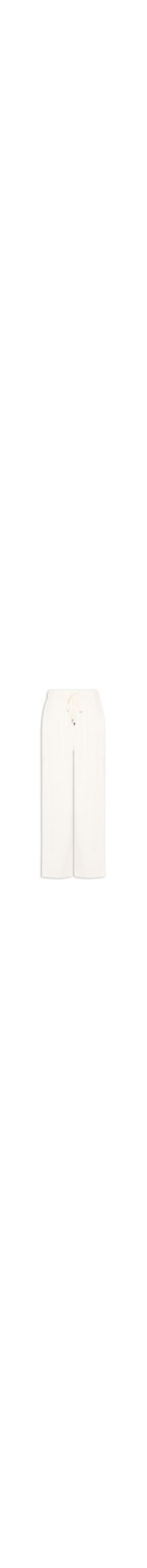 A calça off white é confeccionada em tecido plano com linho de baixa elasticidade. A peça possui cós com elástico embutido e cordão ajustável, bolsos frontais embutidos, caimento reto e amplo ao longo das pernas, comprimento longo, barra simples e acabamento pespontado, sem fechamento adicional.