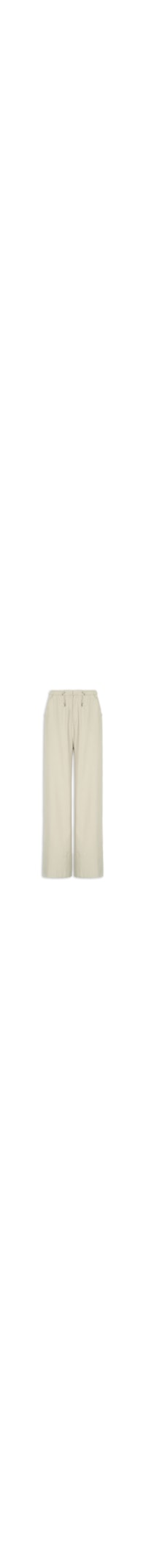 A calça bege é confeccionado em tecido leve com toque de linho e sem elasticidade. A peça solta ao corpo possui cintura média, cós com elásticos embutidos, sendo um deles com ajusta para regulagem frontal, bolsos frontais modelo faca, recortes frontais e posteriores, comprimento longo e fechamento frontal por colchete e zíper.