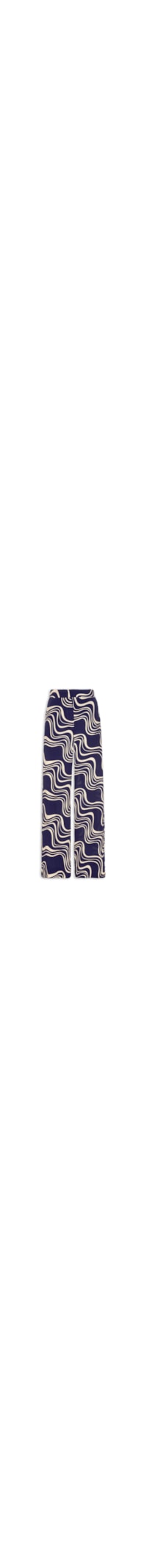 A calça azul marinho é confeccionada em crepe sem elasticidade. A peça de modelo pantalona solta ao corpo possui cintura alta, pences posteriores, bolsos frontais modelo faca, estampa abstrata na cor bege, comprimento longo e fechamento frontal por botão, colchetes e zíper.