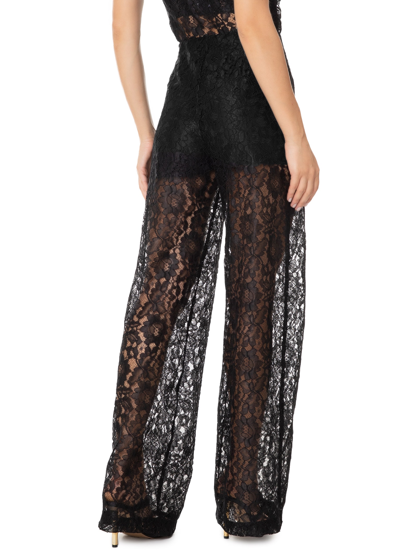A calça preta é confeccionada em renda com baixa elasticidade. A peça solta ao corpo modelo pantalona possui cintura alta, forro, comprimento longo, transparência e fechamento lateral por zíper invisível.