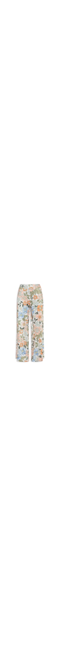 A calça branca é confeccionada em malha. A peça possui cintura alta, cós com elástico embutido na parte posterior, estampa floral em cores contrastantes, fendas laterais, comprimento longo e shape solto.