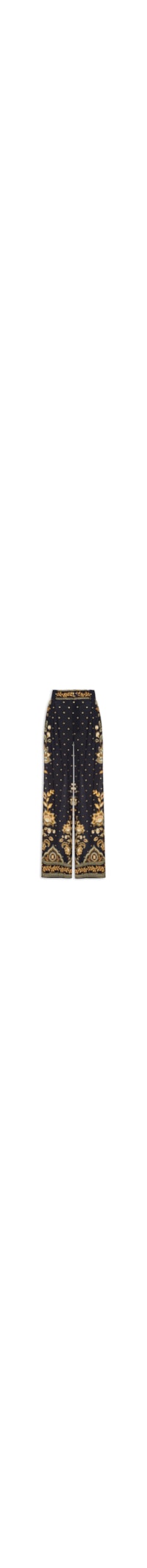 A calça preta é confeccionada em tecido leve com fios de lurex e sem elasticidade. A peça solta ao corpo de modelo pantalona possui cintura alta, cós com passantes em pregas estendidas para a parte frontal, bolsos frontais de modelo faca, barra estendida, mix de estampas em cores contrastantes, comprimento longo e fechamento frontal por zíper e botão interno.