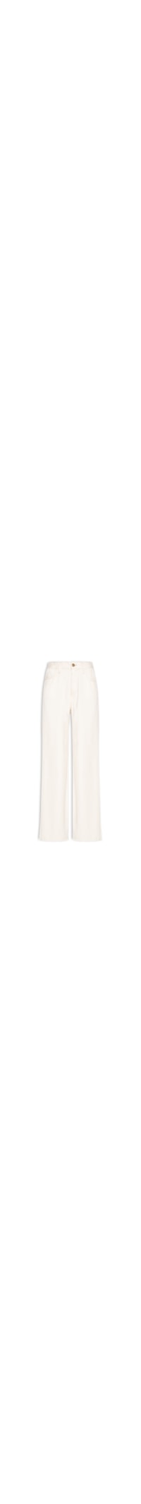A calça off white é confeccionada em sarja sem elasticidade. A peça solta ao corpo possui cintura alta, cós com passantes aplicados, bolsos frontais modelo faca, bolsos posteriores embutidos, recortes na parte posterior, barra cortada a fio, comprimento longo e fechamento frontal por botão e zíper.
