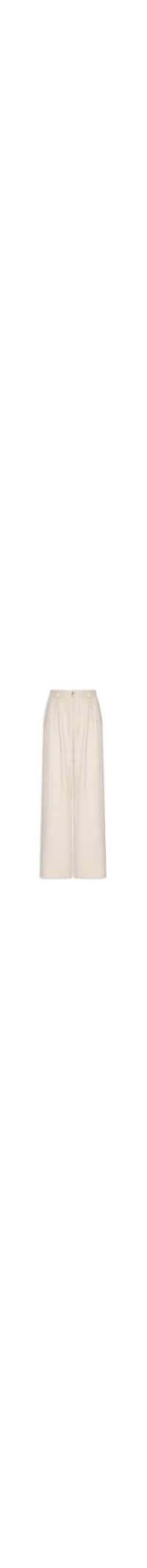 A calça bege é confeccionada em tecido leve sem elasticidade. A peça solta ao corpo modelo pantalona possui cintura alta, cós com passantes e elástico embutido, pregas frontais, bolsos frontais modelo faca, comprimento longo e fechamento frontal por zíper e botão.