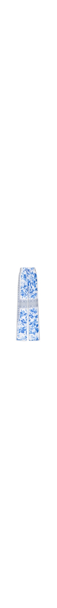 A calça azul é confeccionada em tecido leve sem elasticidade. A peça solta ao corpo possui modelo pantalona, cintura alta, cós com elástico embutido, tira alongada frontal para amarração, mix de estampas em tons contrastantes e comprimento longo.