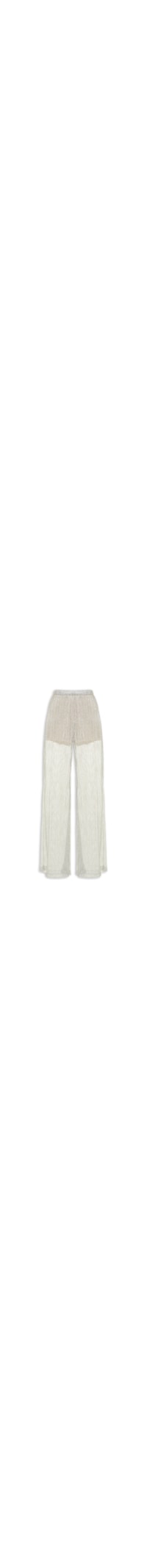 A calça prateada é confeccionada em tule com fios de lurex. A peça de modelo pantalona possui cintura alta, cós com elástico embutido, meio forro, transparência, comprimento longo e shape solto.