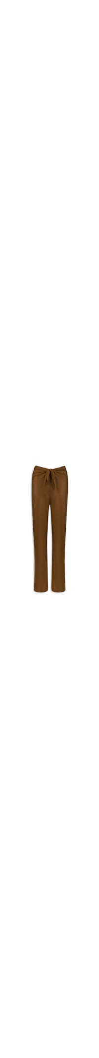 A camisa marrom é confeccionada em tecido leve com baixa elasticidade. A peça levemente solta ao corpo de modelo pareô possui cintura alta, cós com detalhe de nó na parte frontal, leve transparência e comprimento longo.