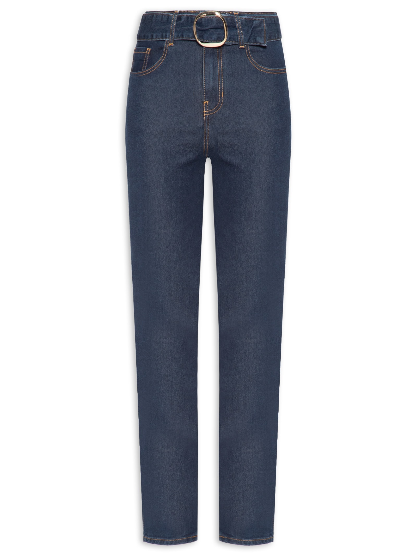 A calça azul é confeccionada em sarja com lavagem jeans sem elasticidade. A peça justa ao corpo de modelo skinny* possui cintura alta, cós com passantes aplicados, five pockets** com rebites metálicos na parte frontal e tag da marca na parte posterior, recorte posterior, comprimento longo e fechamento frontal em zíper e botões. Acompanha cinto em tira média da mesma cor e tecido com ajuste frontal por fivela metálica para uso opcional.