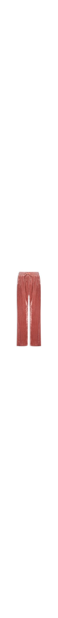 A calça rosa é confeccionado em plush e com média elasticidade. A peça solta ao corpo possui cós com elástico e cordão para amarração frontal embutidos, cintura alta, bolsos frontais embutidos, detalhe de listras em cores contrastantes aplicados nas laterais e comprimento longo.