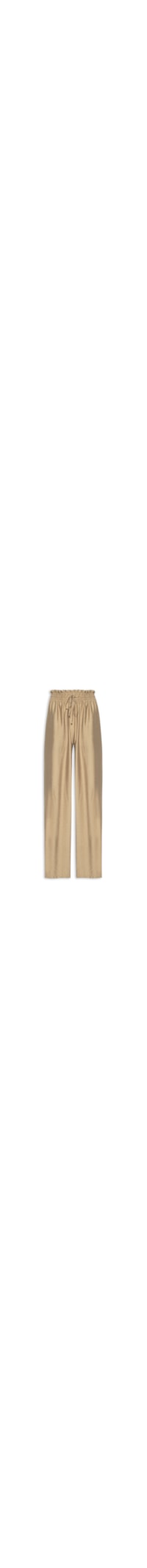 A calça marrom é confeccionada em tecido leve sem elasticidade. A peça solta ao corpo de modelagem reta possui cintura alta, cós em babados com elástico e tira alongada embutida para ajuste e amarração frontal, bolsos frontais embutidos e comprimento longo.