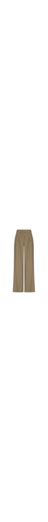 A calça marrom é confeccionada em tecido encorpado com baixa elasticidade. A peça possui cós alto com passantes aplicados, pregas frontais que estruturam o visual, caimento reto ao longo do quadril e das pernas, bolsos laterais embutidos, bolsos posteriores decorativos, barra reta e fechamento frontal por zíper e colchete interno.