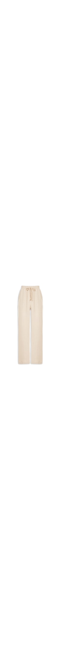 A calça off white é confeccionada em tecido leve sem elasticidade. A peça de modelo pantalona solta ao corpo possui cintura alta, cós com elástico e tira alongada embutida para ajuste e amarração frontal, bolsos frontais modelo faca, padronagem listrada em cor semelhante e comprimento longo.