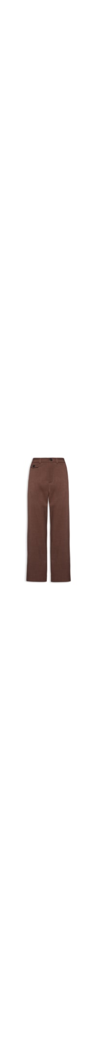 A calça marrom é confeccionada em tecido leve com baixa elasticidade. A peça de modelo reta solta ao corpo possui cintura alta, cós com passantes, pences posteriores, bolsos posteriores decorativos, bolsos frontais modelo faca, vista, aba sobreposta na parte frontal na altura do cós com botão aplicado, comprimento cropped* e fechamento frontal por botão e zíper.