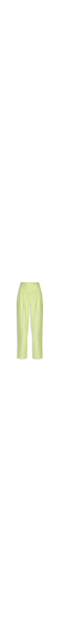 A calça verde é confeccionada em tecido leve. A peça possui cintura alta, cós com pala ampla, bolsos frontais embutidos, detalhes de pregas frontais, pences posteriores, shape solto e fechamento por botões forrados.
