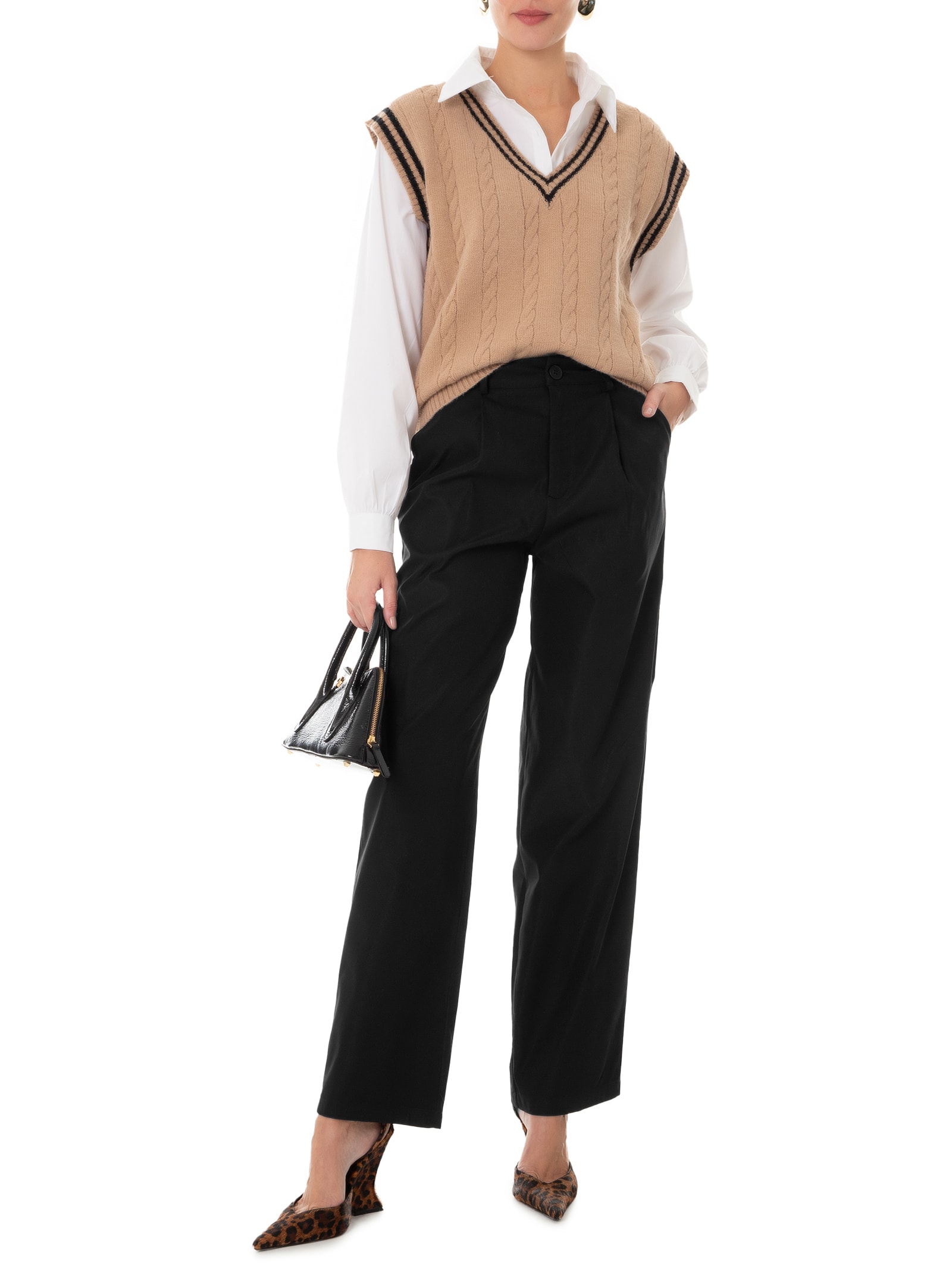 Tons neutros trazem um ar moderno e atemporal a produção. Aposte nesta calça Market 33 combinada com uma camisa lisa, colete, brincos e sapatos de salto.