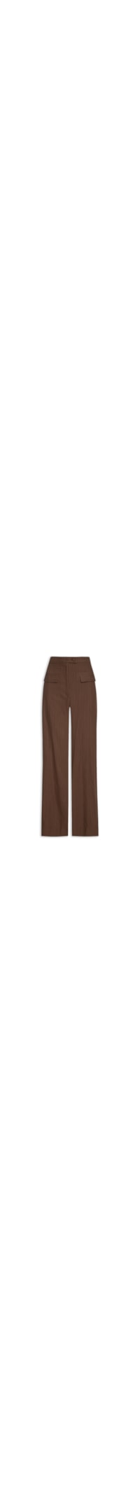 A calça marrom é confeccionada em tecido leve sem elasticidade. A peça solta ao corpo possui cintura alta, recortes frontais e posteriores, bolsos frontais decorativos, padronagem de risca de giz em cor contrastante, comprimento longo e fechamento frontal por zíper e botões.