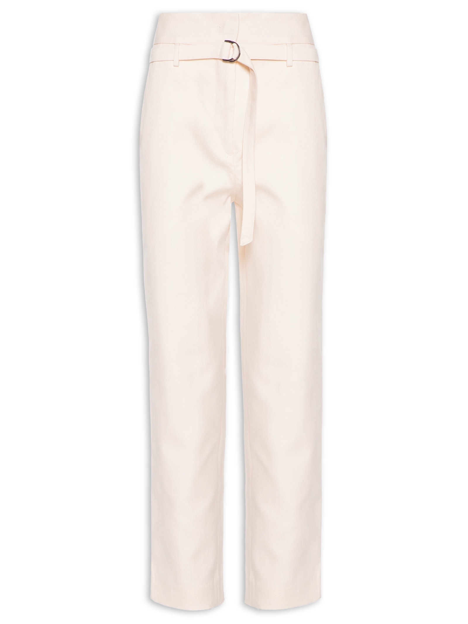 A calça rosa é confeccionada em tecido leve sem elasticidade. A peça solta ao corpo possui cintura alta, cós com passantes aplicados, bolsos frontais de modelo faca, bolso posterior embutido, comprimento *cropped, tag metalizada da marca aplicada na parte posterior e fechamento frontal por zíper e colchete. Acompanha cinto de mesmo tecido com espessura média e fivela metálica arredondada para uso opcional.