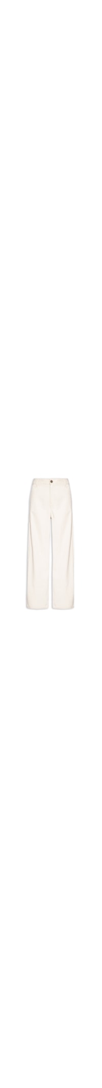 A calça off white é confeccionada em sarja com toque de linho sem elasticidade. A peça de modelo wide leg solta ao corpo possui cintura alta, cós com passantes e tag da marca aplicada em metal na parte posterior, bolsos frontais modelo faca, pences e bolsos posteriores, detalhe de tecido sobreposto as laterais com acabamento corte a fio, comprimento longo e fechamento frontal por botão e zíper.