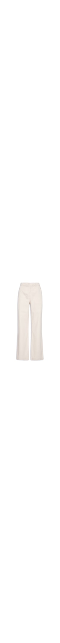 A calça bege é confeccionada por sarja com toque em linho sem elasticidade. A peça solta ao corpo possui cintura alta, passantes aplicados no cós, bolsos frontais no modelo faca, tag da marca aplicado no cós, bolsos posteriores, fechamento por botão e zíper frontal e comprimento longo.