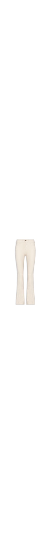 A calça bege é confeccionada por sarja com lavagem em jeans com baixa elasticidade. A peça justa ao corpo possui cintura alta, passantes aplicados no cós, five pockets* com rebites, tag metálica da marca aplicada no bolso posterior, comprimento longo e fechamento frontal por zíper e botão.