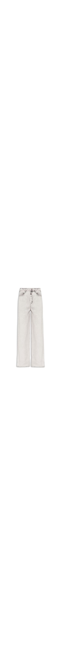 A calça preta é confeccionada em sarja sem elasticidade. A peça solta ao corpo possui cintura alta, cós com passantes aplicados, *five pockets, recortes posterior, efeito estonado, comprimento longo e fechamento frontal por zíper e botão.