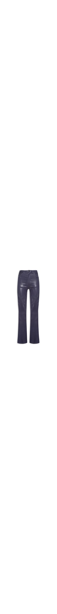 A calça azul marinho é confeccionada em sarja com superfície resinada e alta elasticidade. A peça justa ao corpo possui cintura alta, cós com passantes e tag da marca aplicada na parte posterior, recorte posterior, five pockets* com detalhe de rebites na parte frontal, logo da marca aplicado em metal no bolso posterior com acabamento fosco preto, barras com acabamento em corte à fio, comprimento longo e fechamento frontal por botão e zíper.