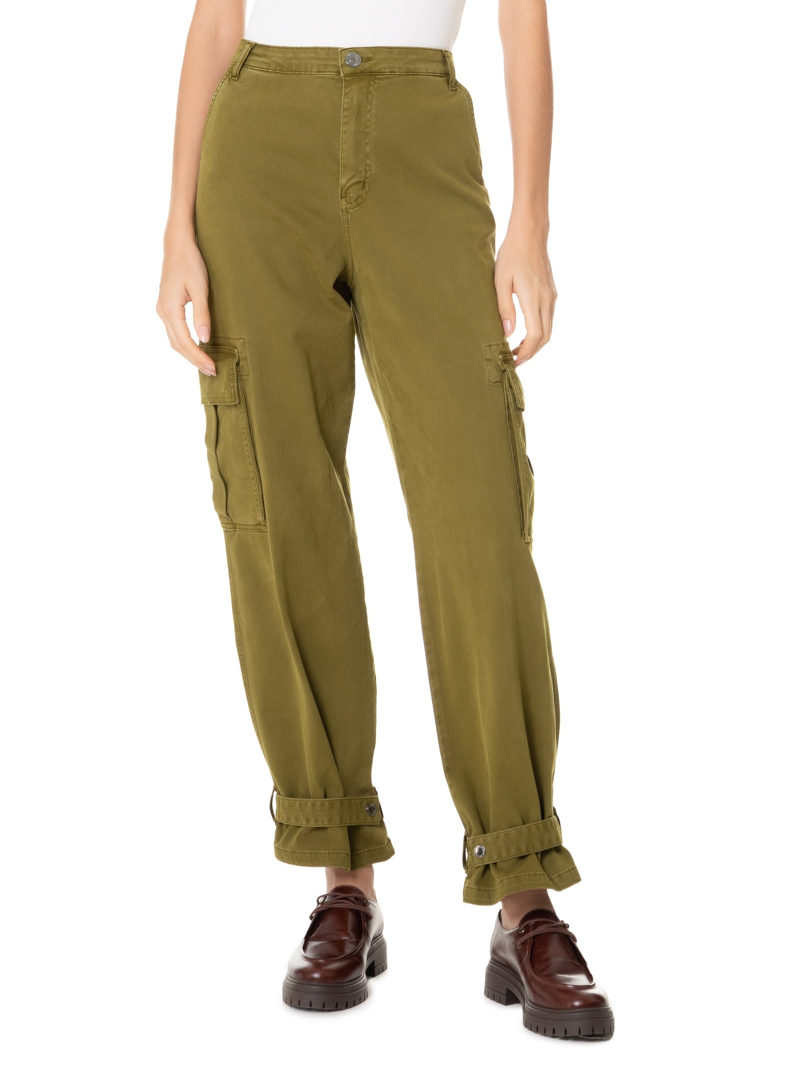 A calça baixa elasticidade. A peça solta ao corpo possui cintura alta, cós com passantes e tag da marca bordada na parte posterior, bolsos e pences posteriores, logo da marca aplicado em metal no bolso posterior, recortes posteriores, bolsos frontais modelo faca, bolsos laterais modelo cargo, faixas médias sobrepostas nas barras com fechamento por botão de pressão, comprimento longo e fechamento frontal por botão e zíper.