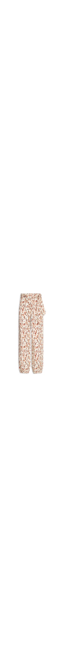 A calça amarela é confeccionada em sarja sem elasticidade. A peça solta ao corpo possui cintura média, cós com passantes, bolsos frontais e posteriores, recorte frontal, comprimento longo, mix de estampas em cores contrastantes, faixa alongada removível para amarração e fechamento frontal por botões e zíper.