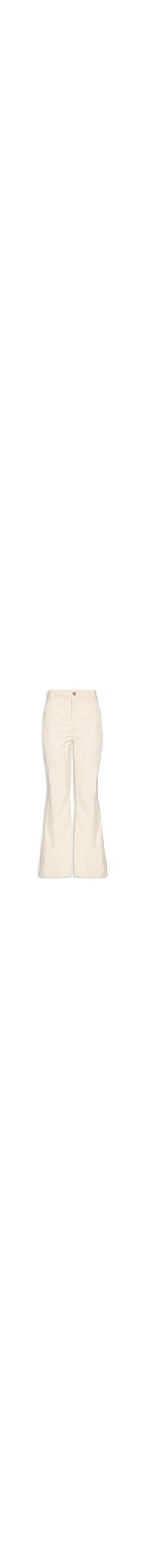 A calça bege é confeccionada em sarja sem elasticidade. A peça solta ao corpo possui cintura alta, cós com passantes embutidos, dois bolsos frontais estilo faca, dois bolsos posteriores, comprimento longo e fechamento frontal por zíper e botão.