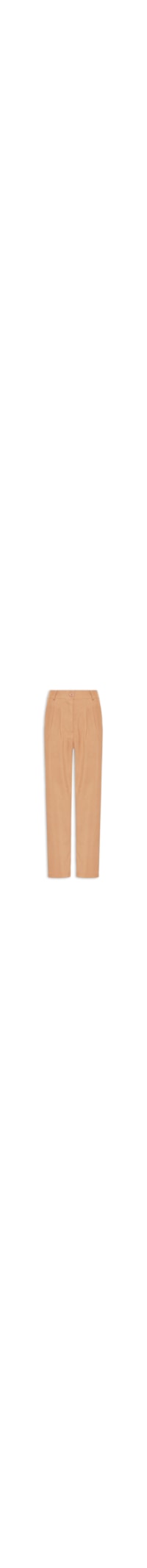 A calça bege é confeccionada em tecido leve com baixa elasticidade. A peça solta ao corpo possui cintura alta, cós com passantes aplicados, bolsos frontais modelo faca, pregas na parte frontal, comprimento longo e fechamento frontal por botão e zíper.