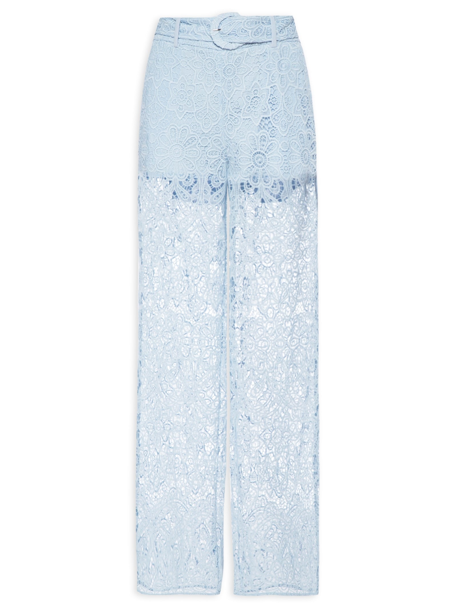A calça azul é confeccionada em renda sem elasticidade. A peça solta ao corpo possui cintura alta, cós com passantes aplicados, bolsos frontais de modelo faca, pences posteriores, padronagem floral com recortes vazados, forro em short curto, tag metalizada da marca aplicada na parte posterior, comprimento longo e fechamento lateral em zíper invisível. Acompanha cinto de espessura média da mesma cor e tecido com fivela forrada para uso opcional.