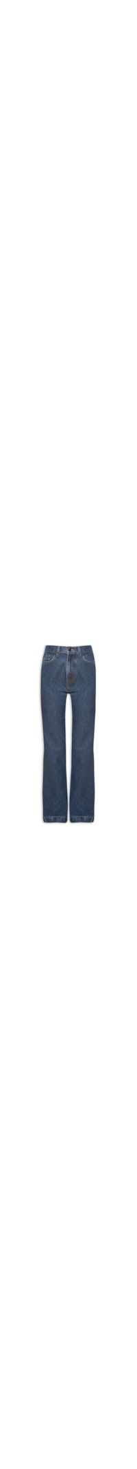 A calça Azul é Confeccionada Em sarja Com Lavagem Em Jeans, Superfície Resinada E Sem Elasticidade. A Peça Solta Ao Corpo, Possui Cintura Alta, Cós Com Passantes, Five Pockets* Com Rebites Aplicados, Logo Da Marca Aplicado Em Metal No Bolso Posterior, Comprimento Longo E Fechamento Frontal Por Botão E Zíper.