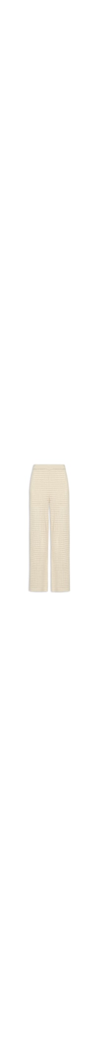 A calça bege é confeccionada em tricot com média elasticidade. A peça solta ao corpo possui cintura alta, cós com elástico embutido, transparência e comprimento longo.